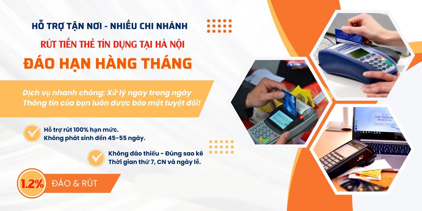 Nhiều chi nhánh khắp Hà Nội, phí chỉ từ 1.2% và nhiều chính sách hỗ trợ khi khách sử dụng dịch vụ hàng tháng